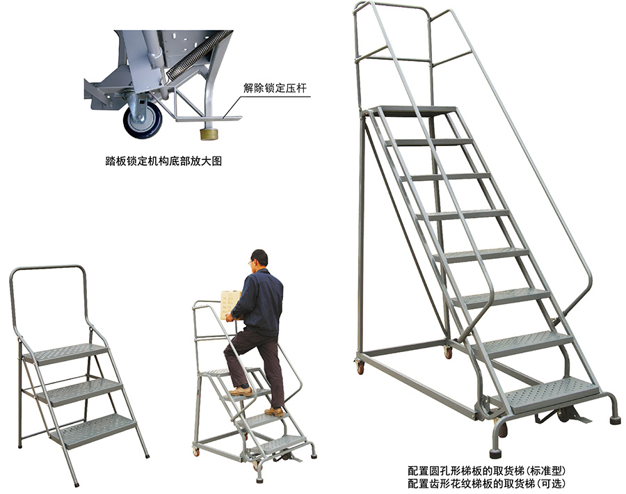 ● 優客力配置踏板鎖定機構,踩壓底部踏板可自動固定梯子,踩壓底部踏板下方的解除鎖定壓桿,便可輕松移動取貨梯。