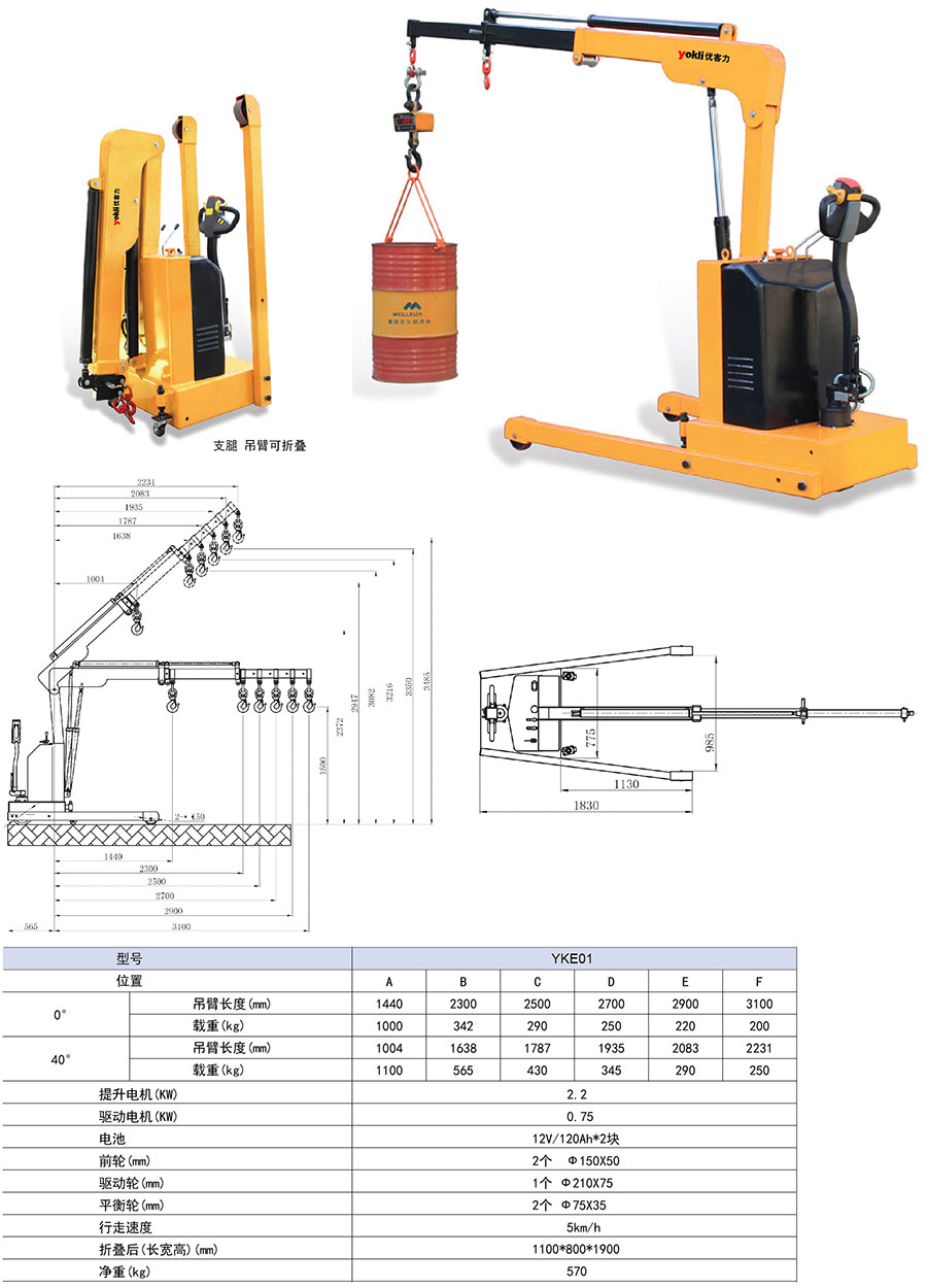 ● 電動行走,電動起升,吊臂電動伸縮。