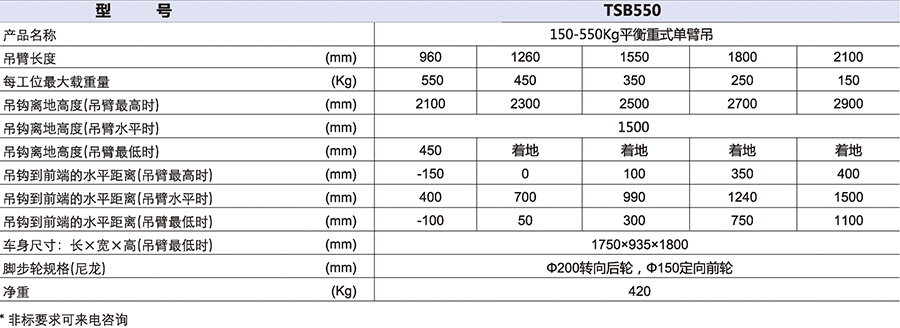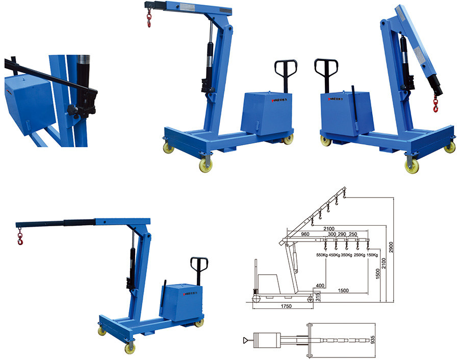 ● 吊臂長度可五工位手動調節,配有鍛造重載可旋轉吊鉤。